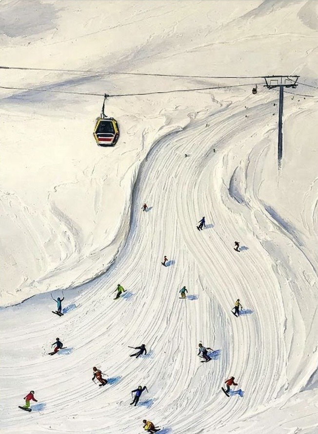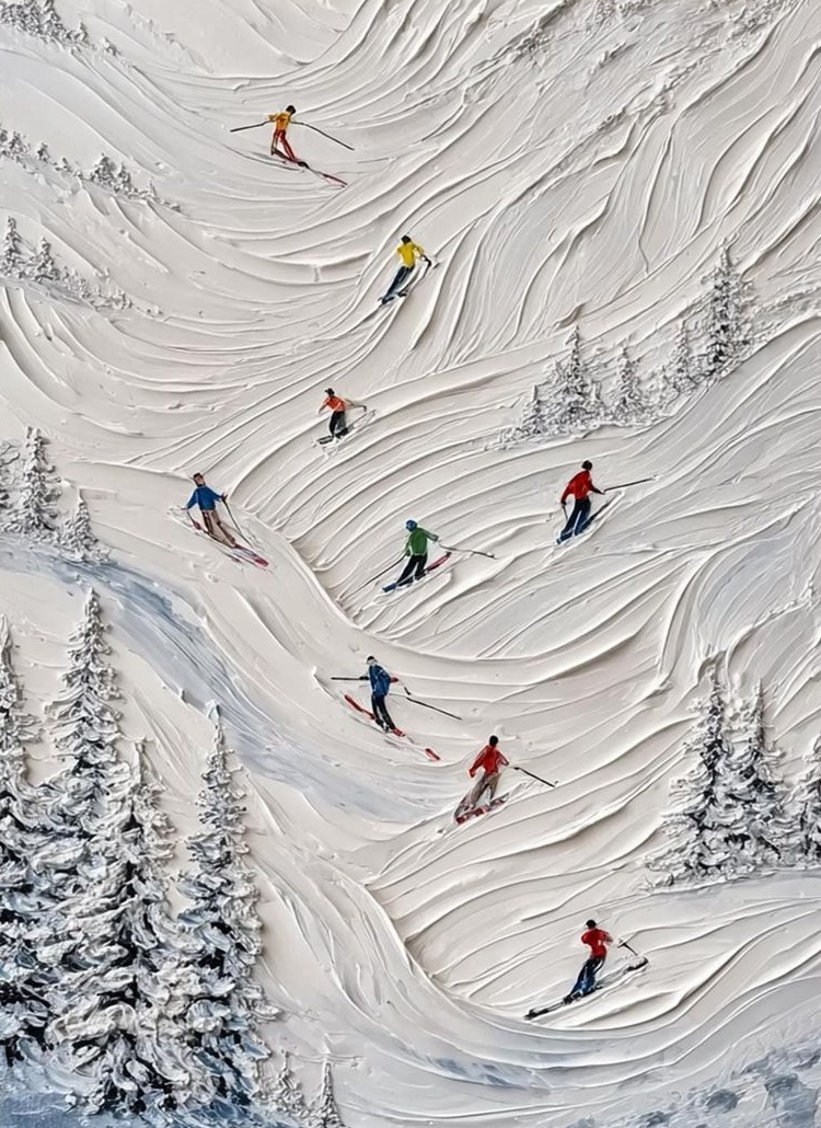 Doprajte si tvorivý zážitok plný farieb, textúr a emócií na kurze maľby minimalistického obrazu zimnej krajiny s lyžiarmi.